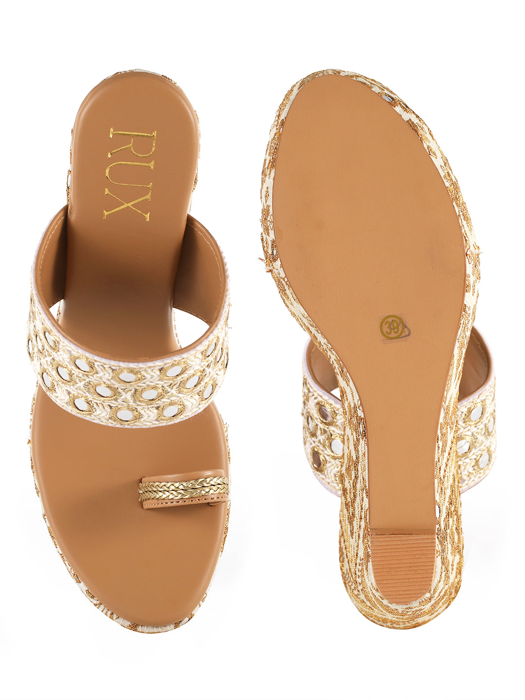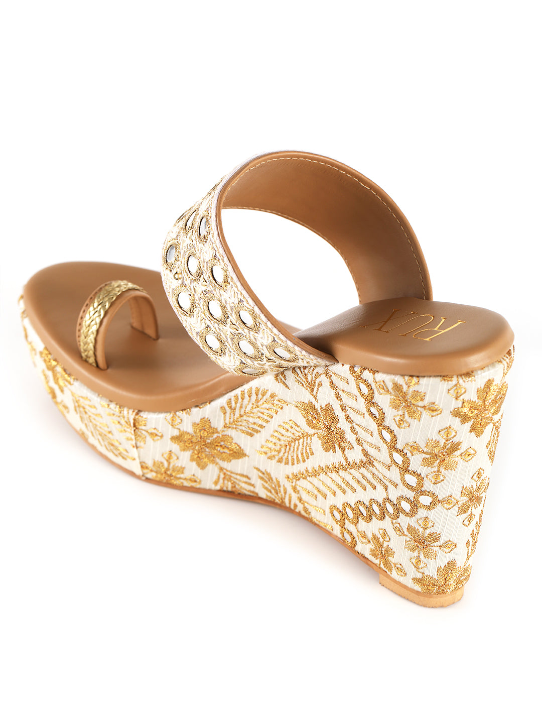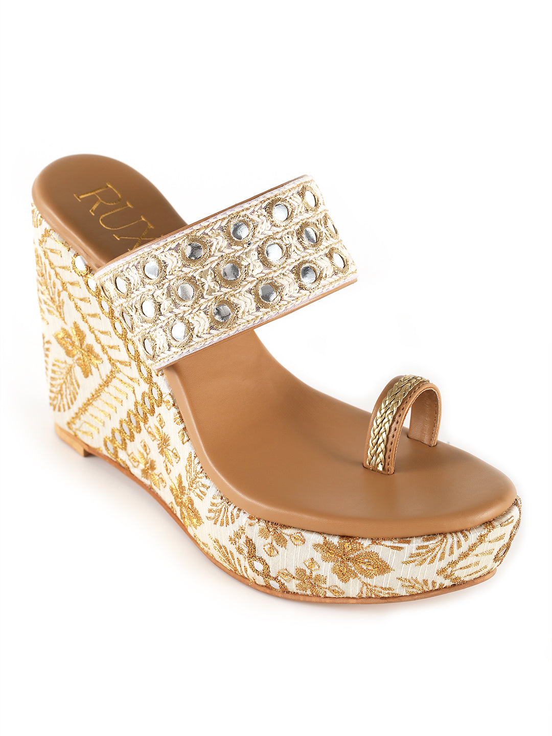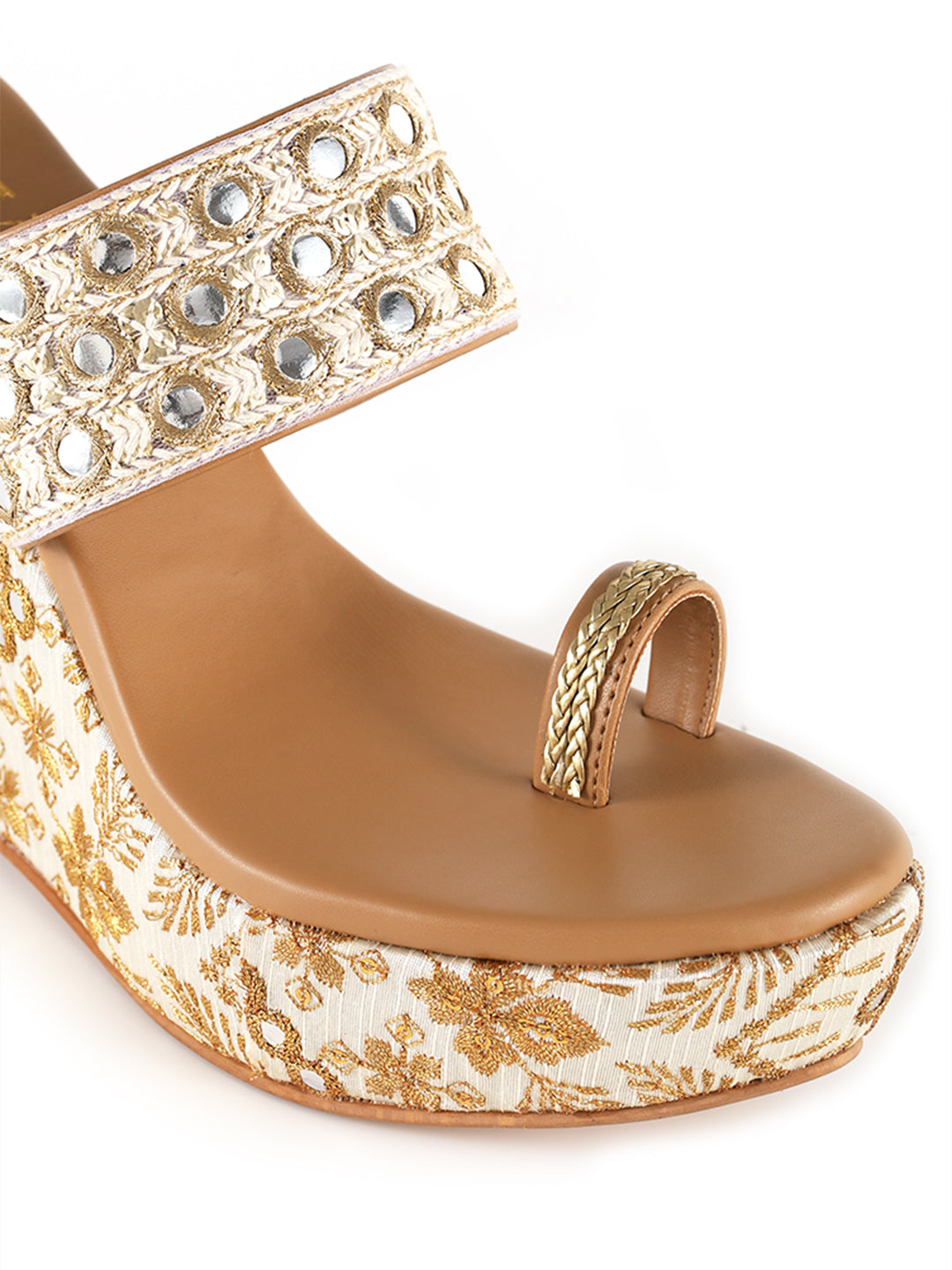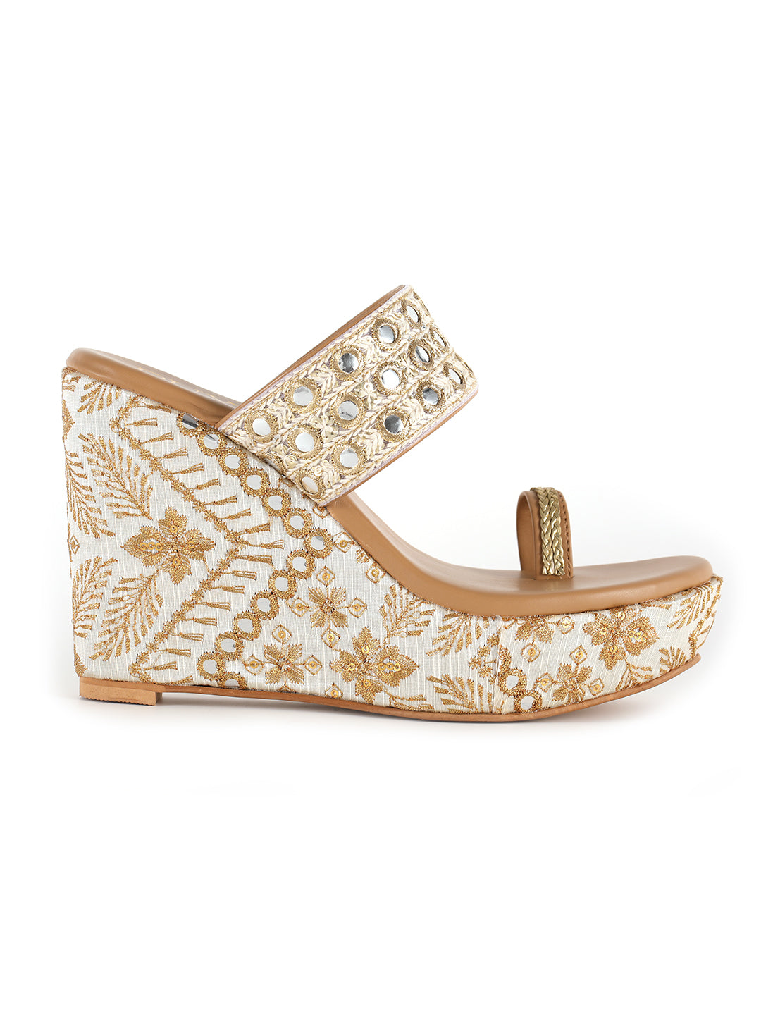 Elevate your ethnic style with these stunning wedge heels, adorned with intricate mirror and zari work for a regal touch.