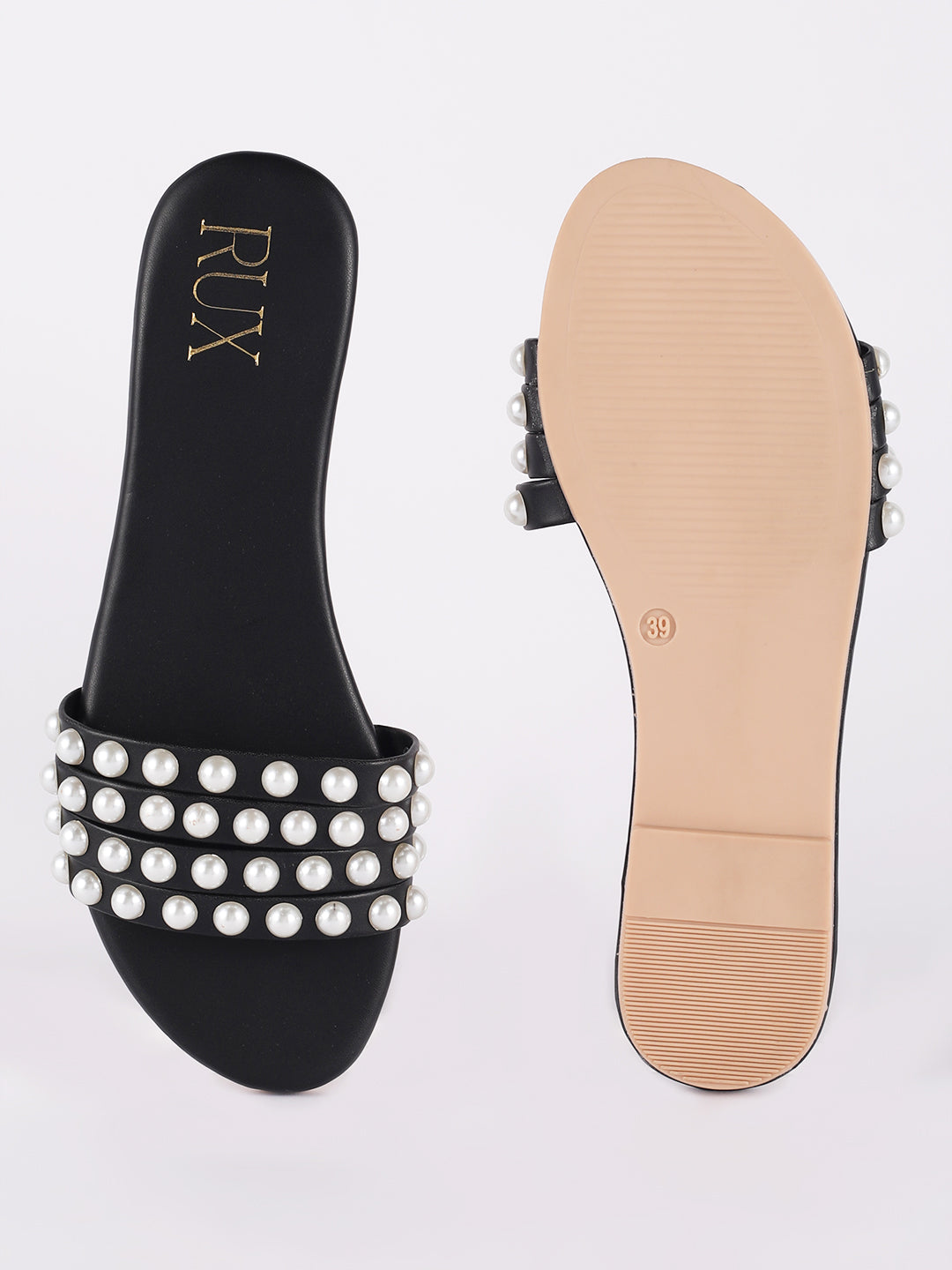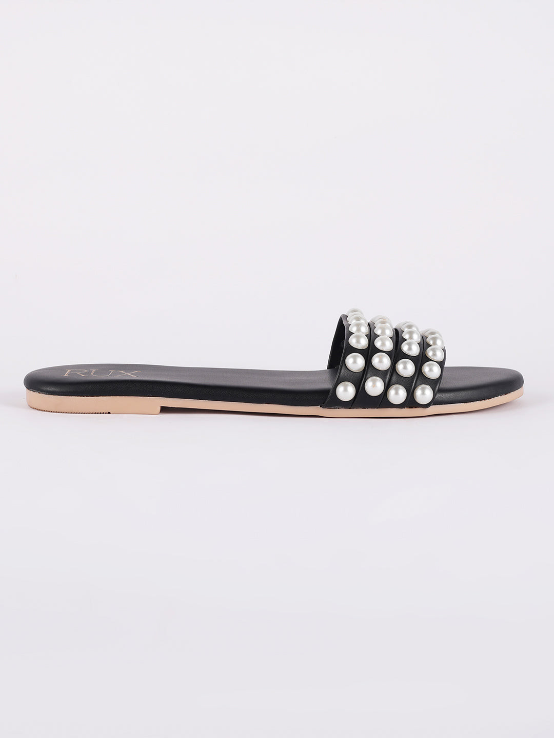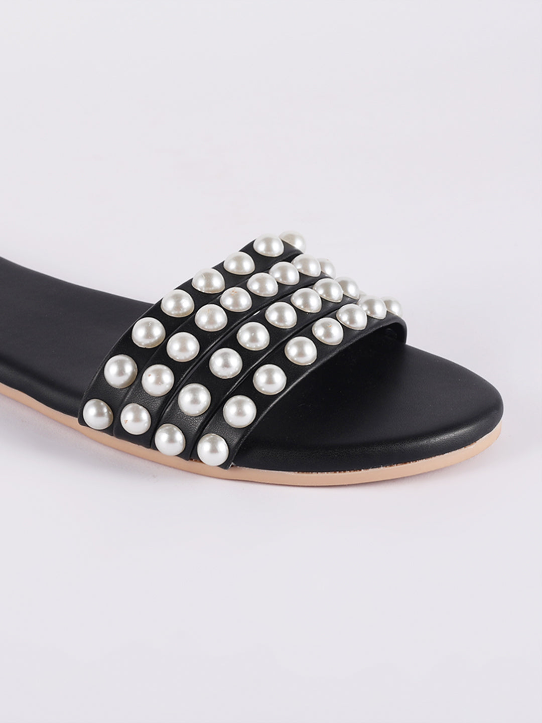 - - - Black slip-on sandals with pearl-adorned strap, Cushioned footbed for comfort