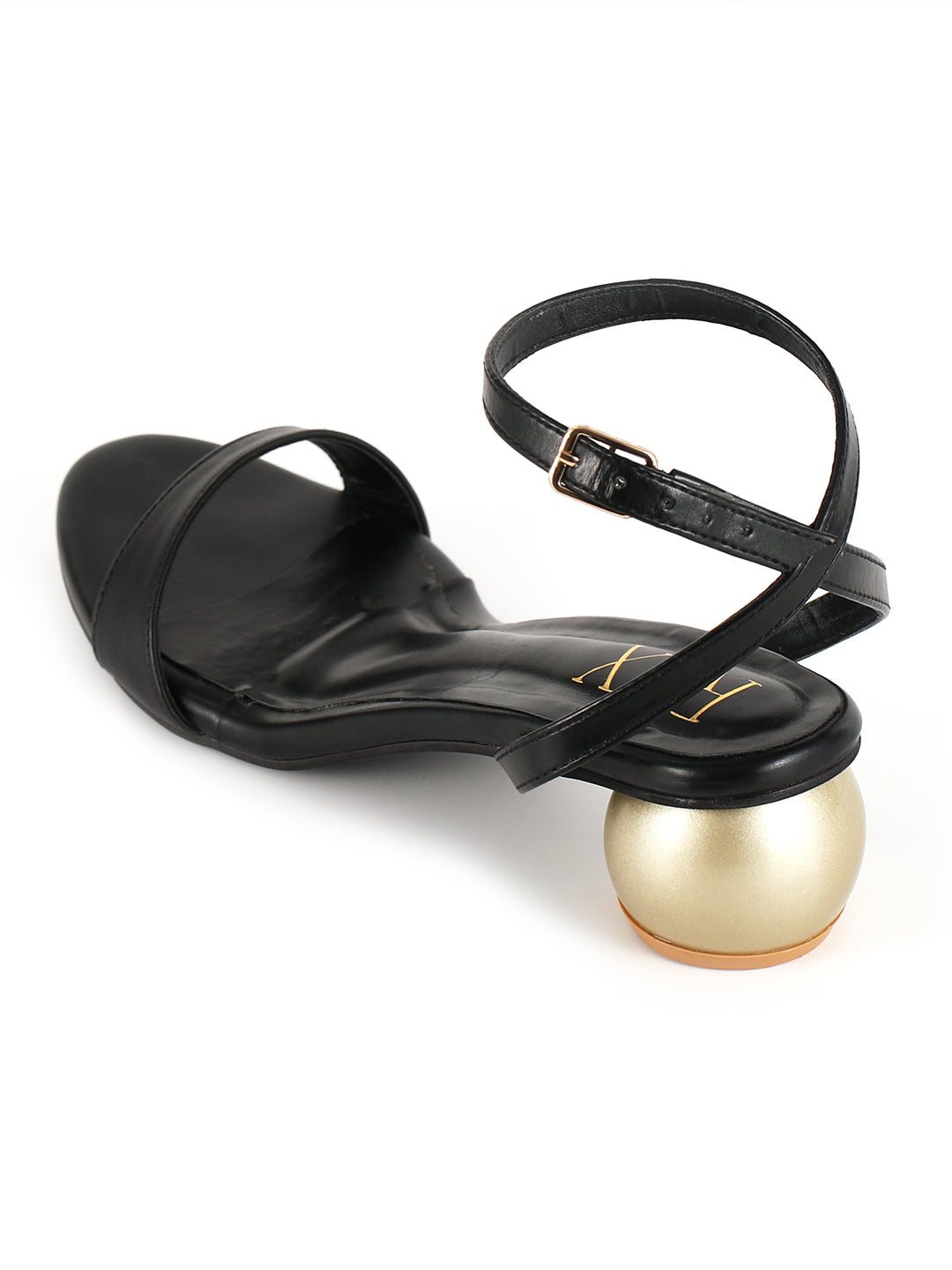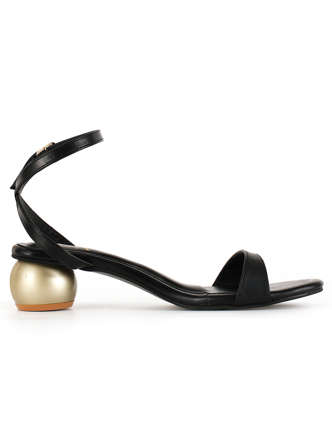 Elegant black strappy sandals with a unique metallic gold round block heel, ideal for adding a touch of sophistication to any outfit.