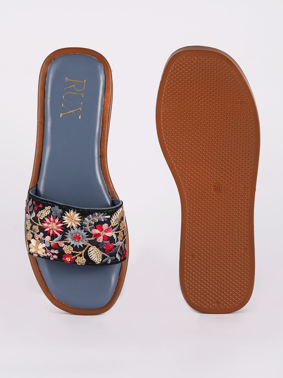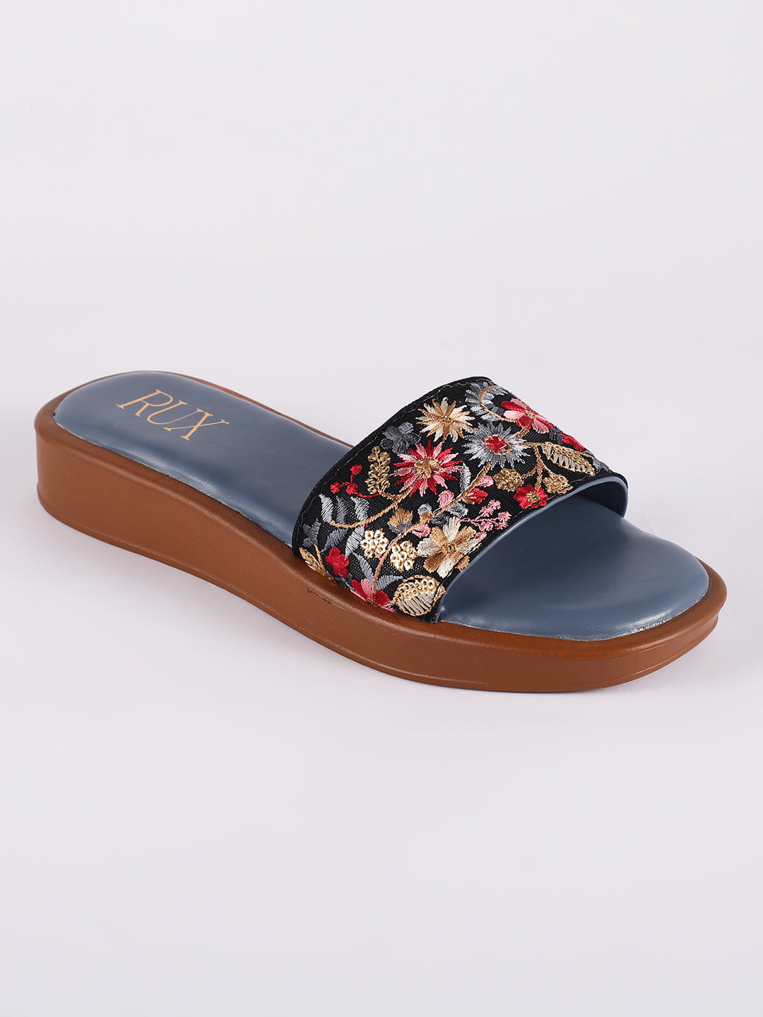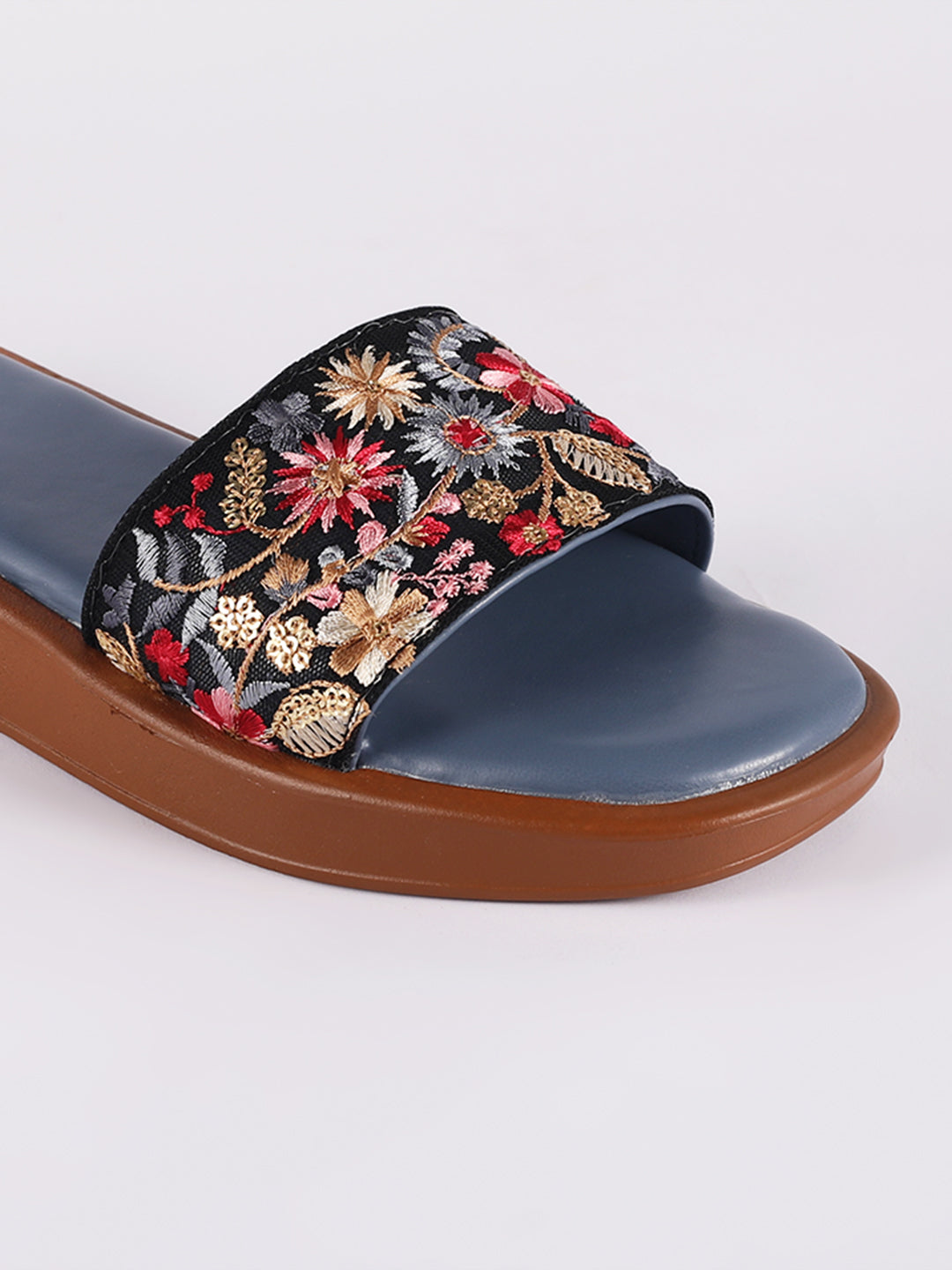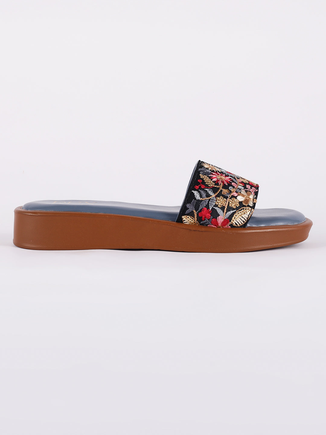 These stylish slip-on sandals feature intricate floral embroidery, set on a wide strap, paired with a comfortable cushioned footbed. The brown platform sole adds a subtle lift while maintaining ease of movement.