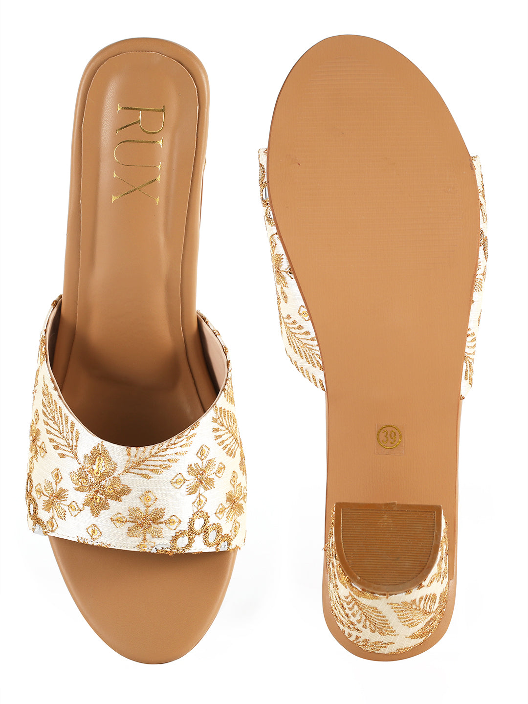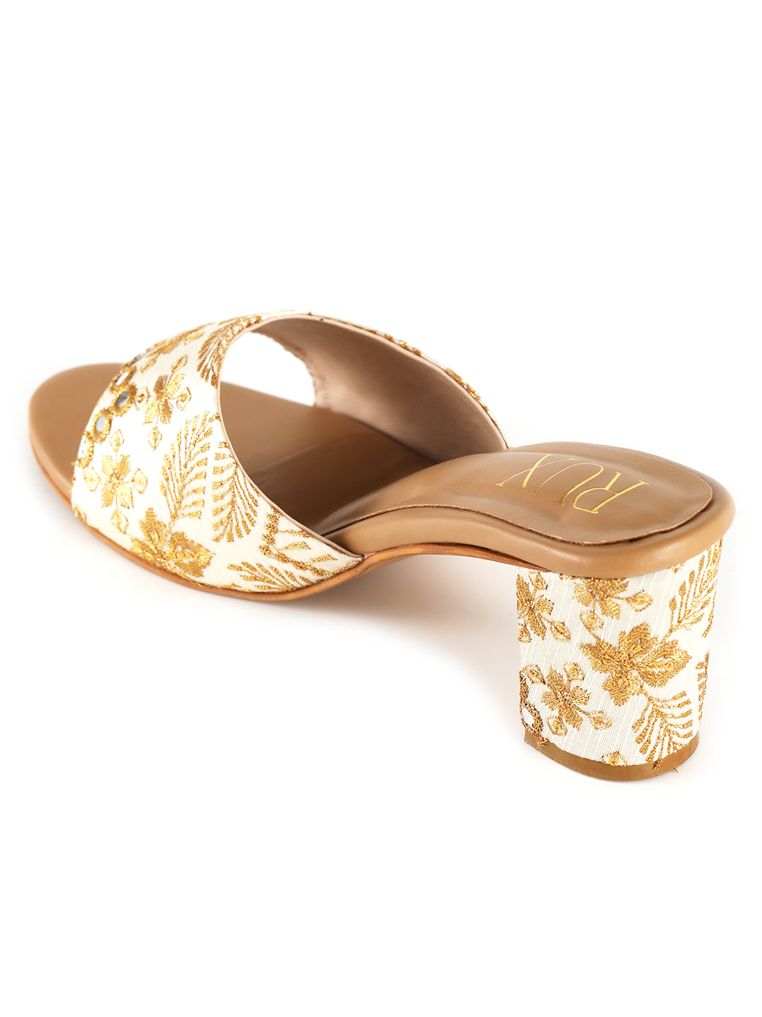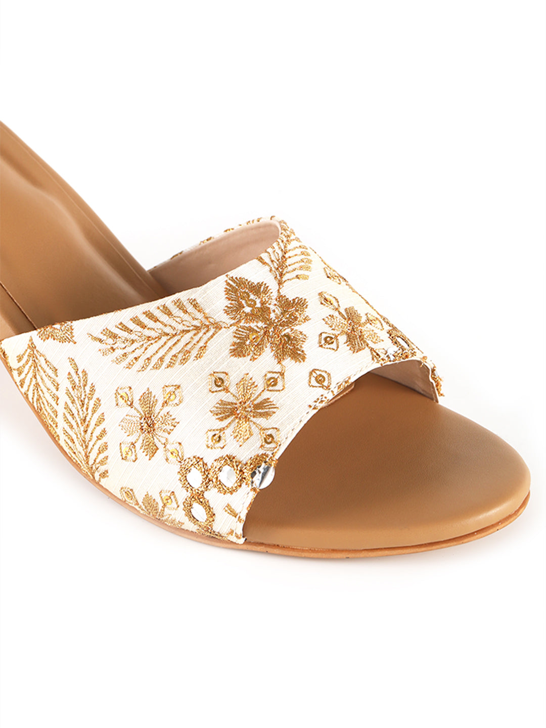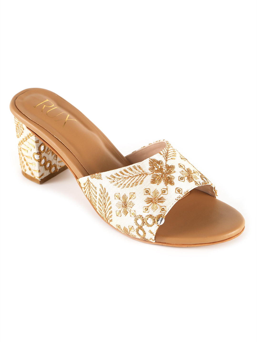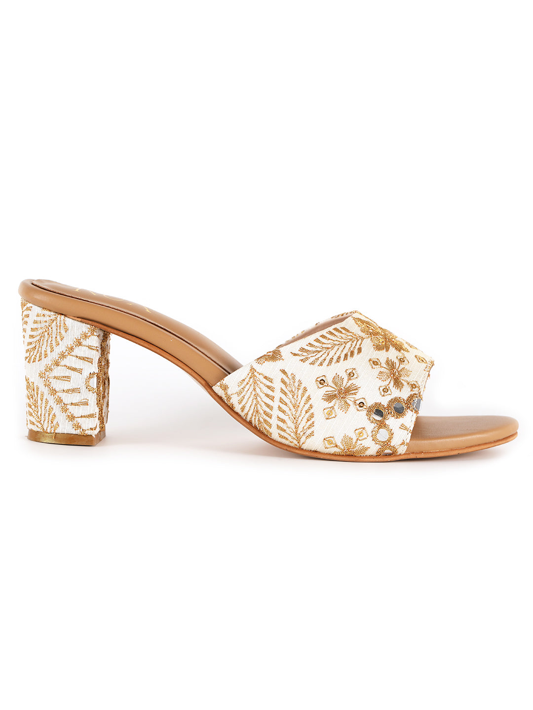 Elegant embroidered block heels featuring intricate gold zari work and subtle mirror embellishments, perfect for festive and wedding occasions.