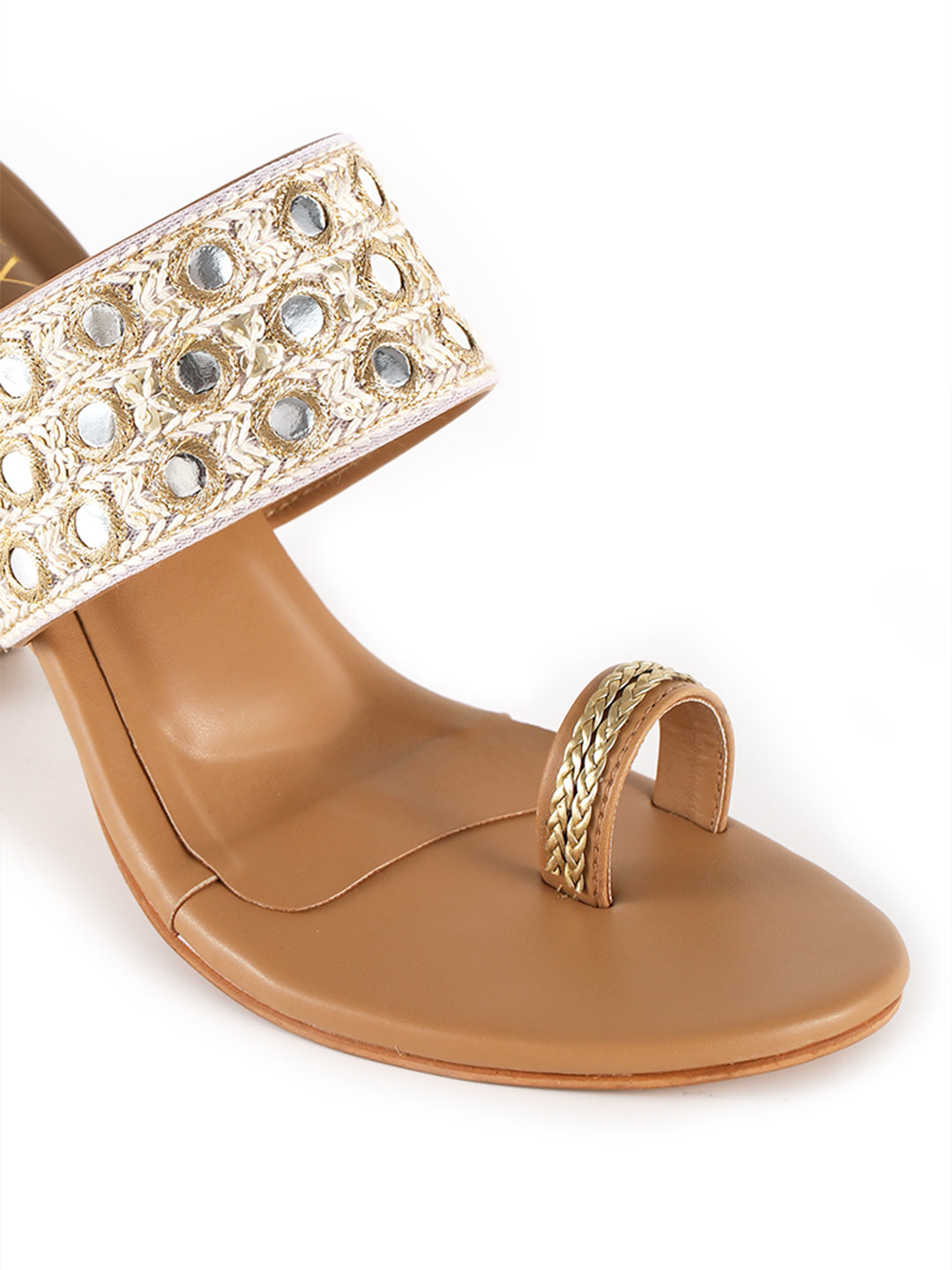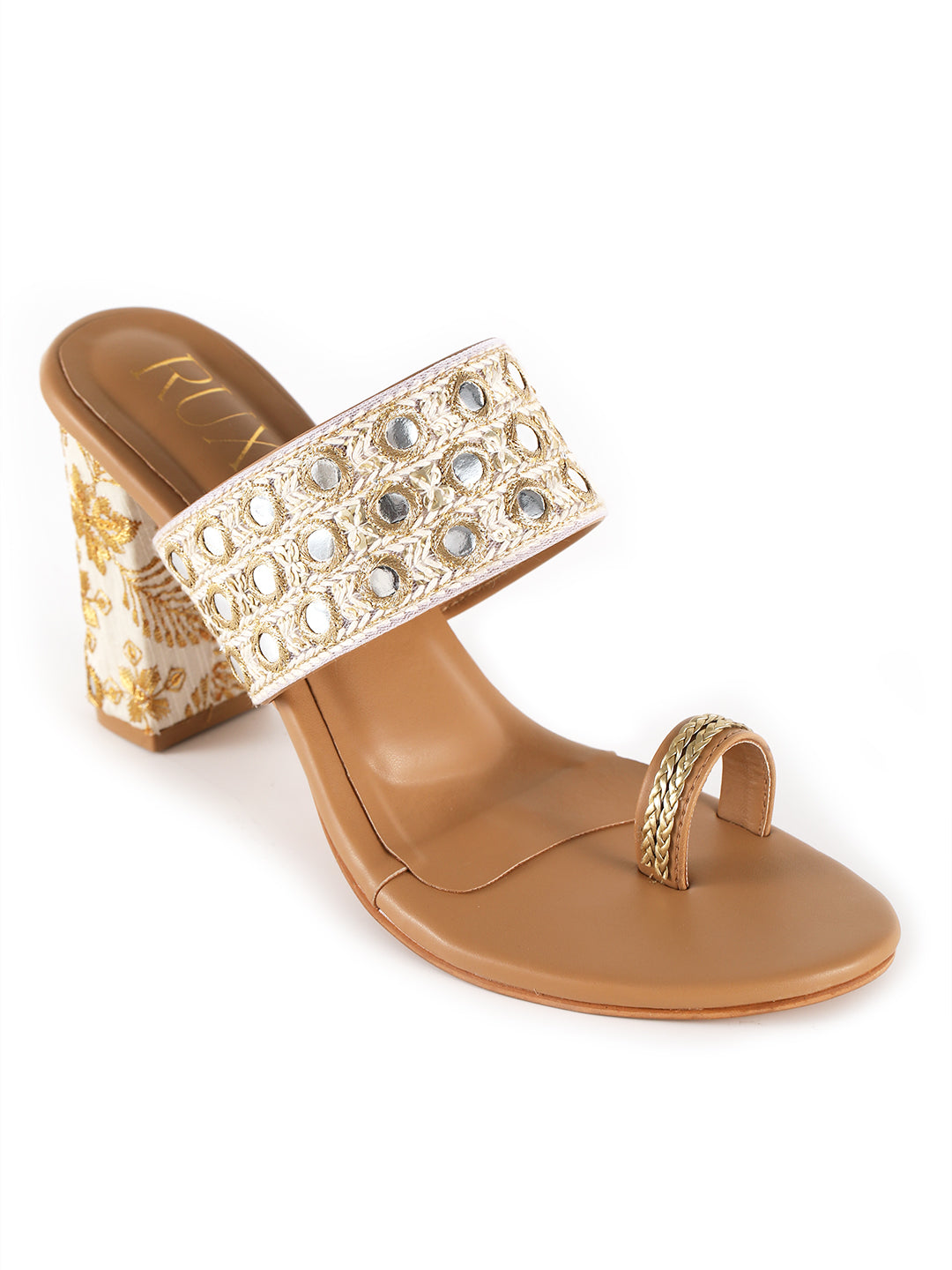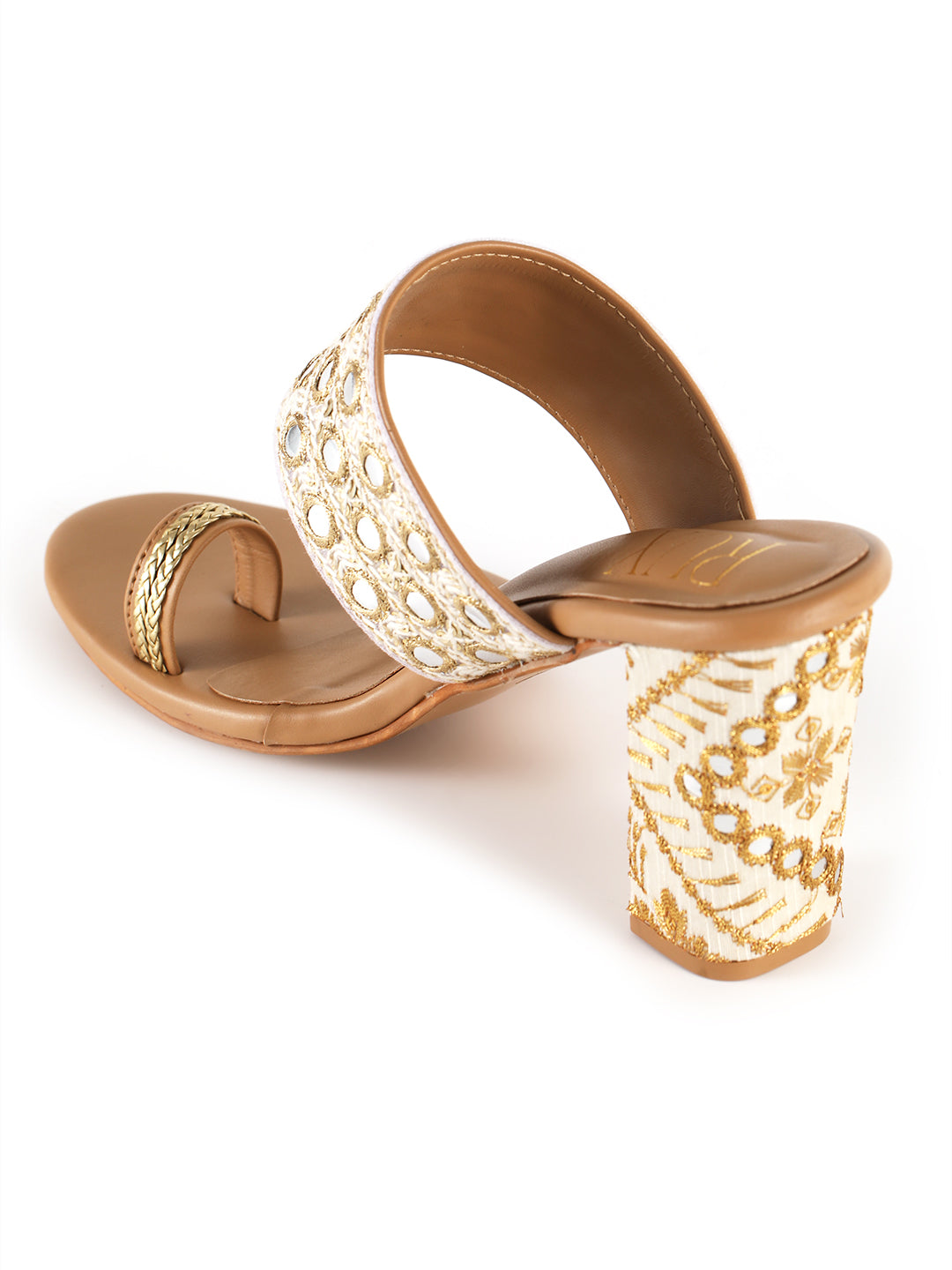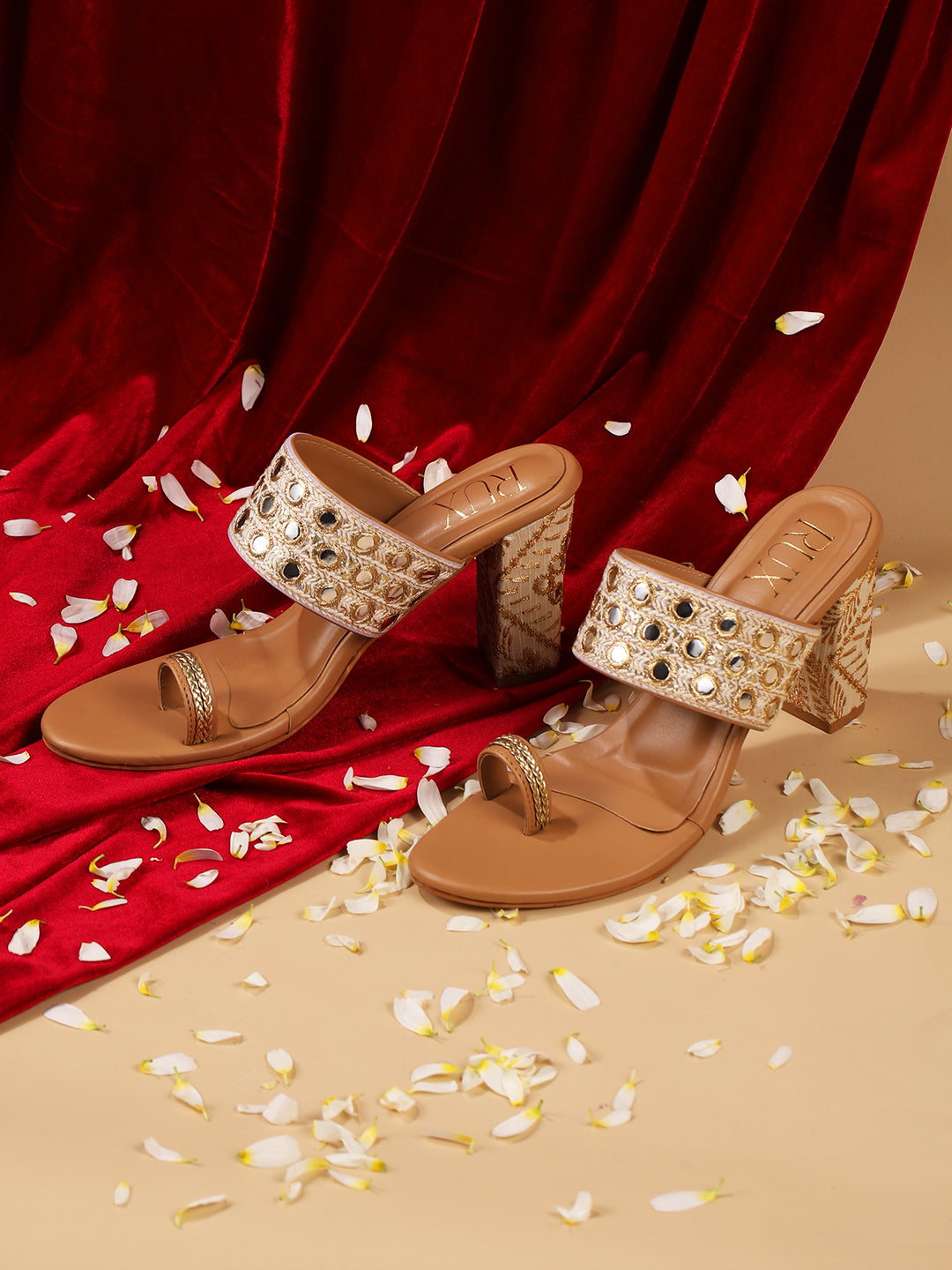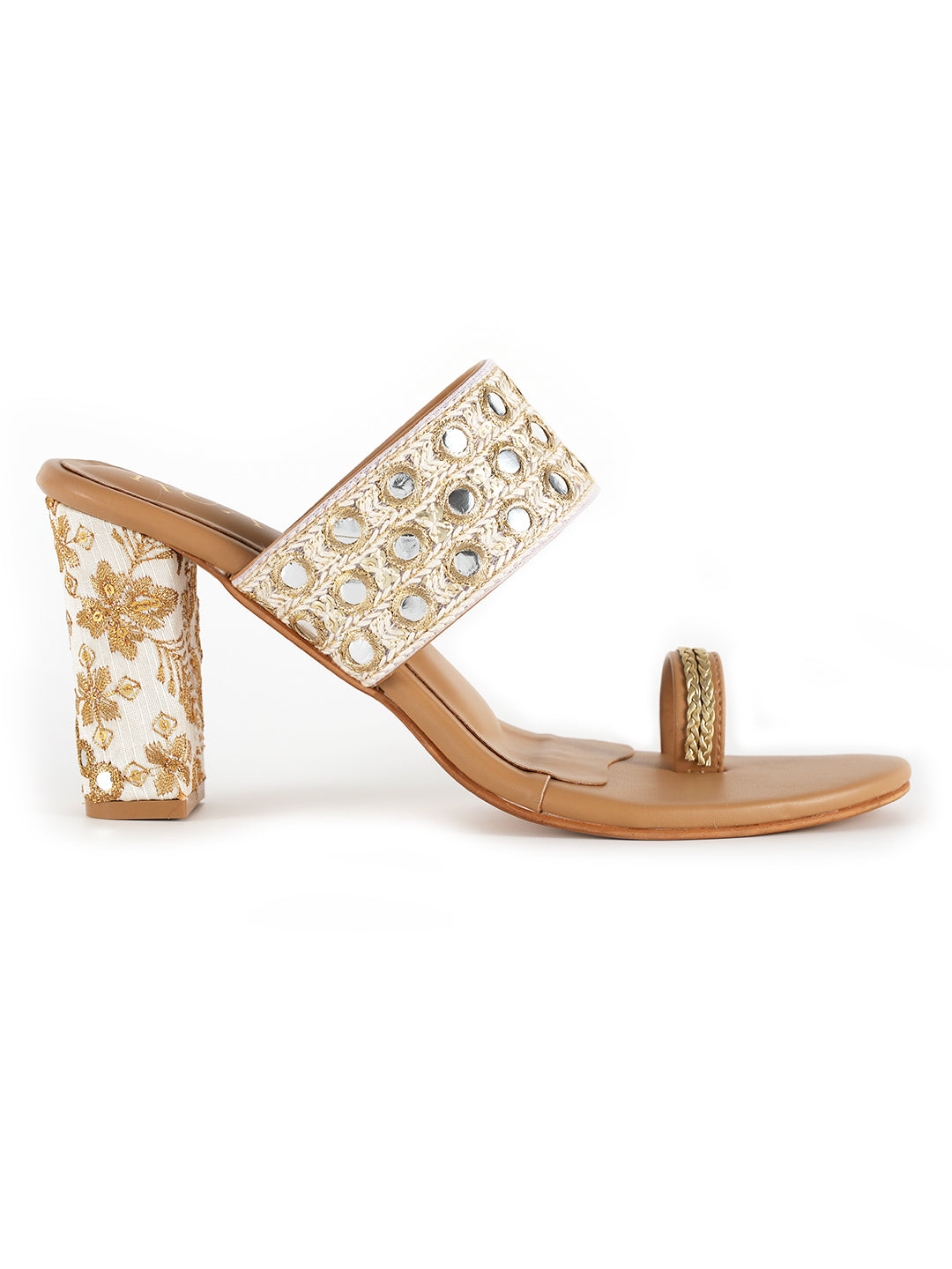 Exquisite handcrafted block heels featuring intricate mirror and zari embroidery, designed for effortless elegance and comfort.