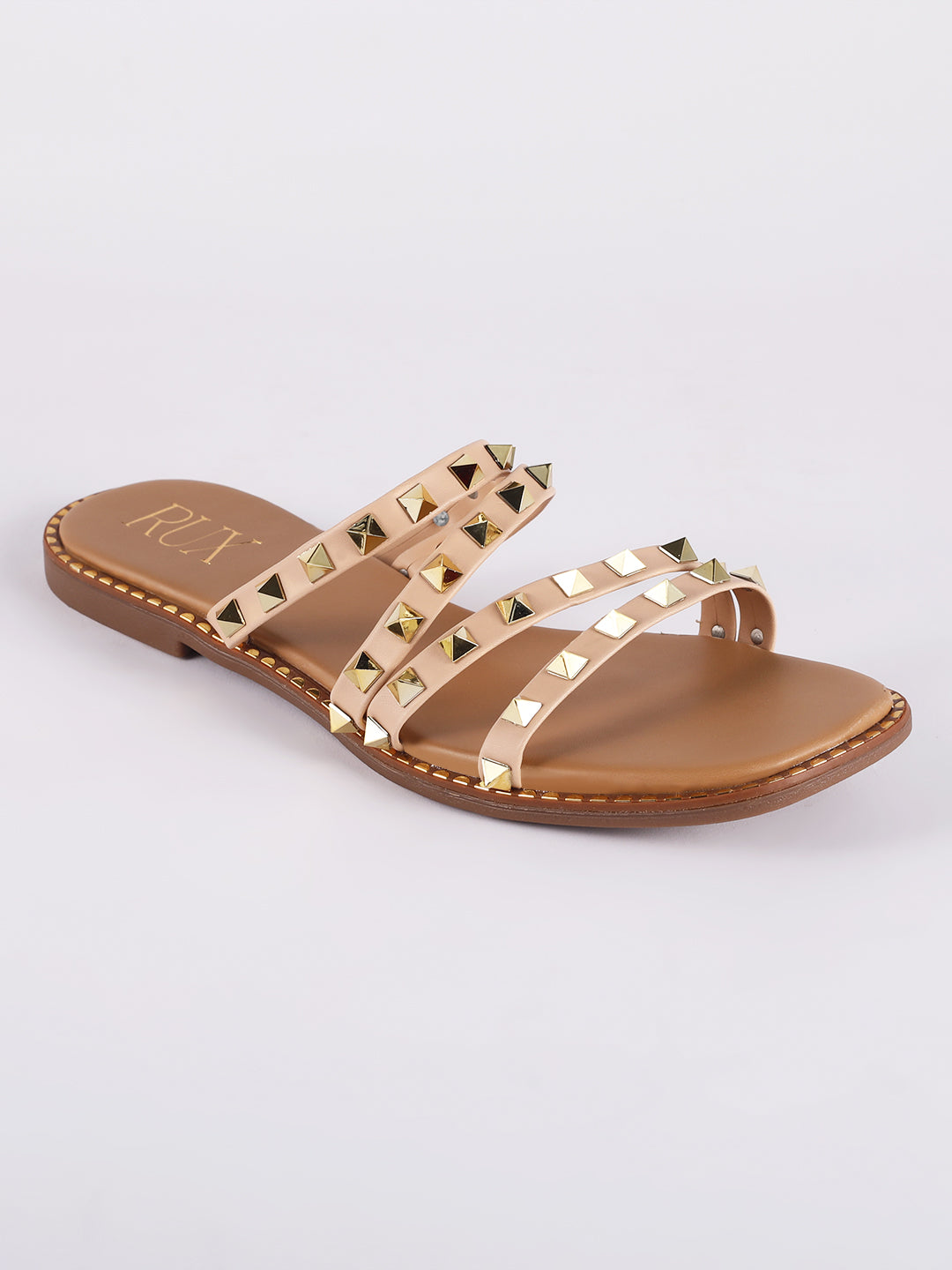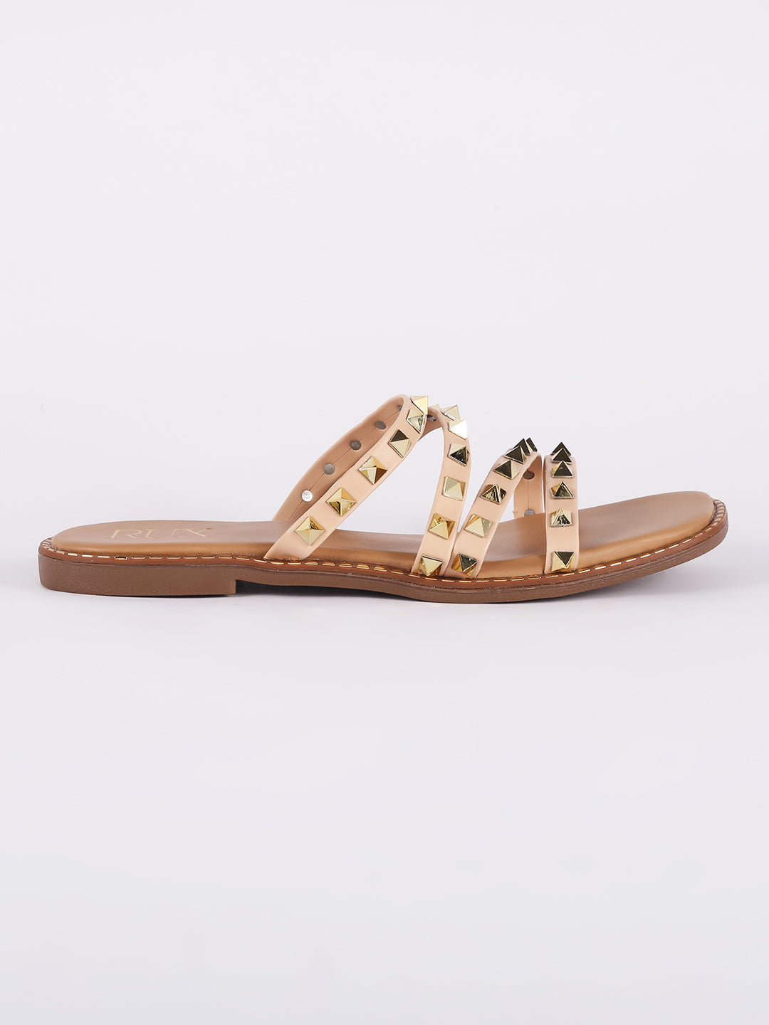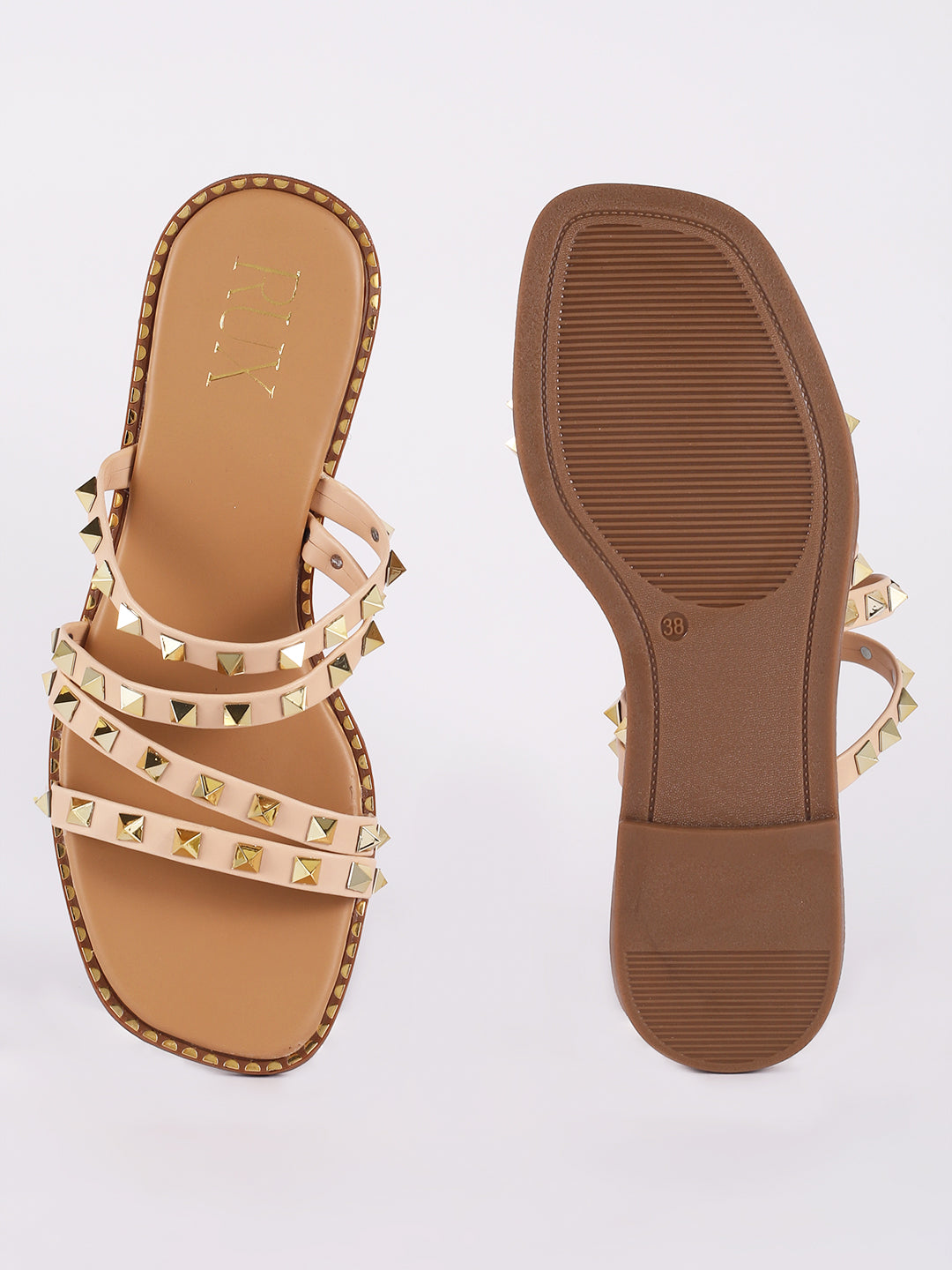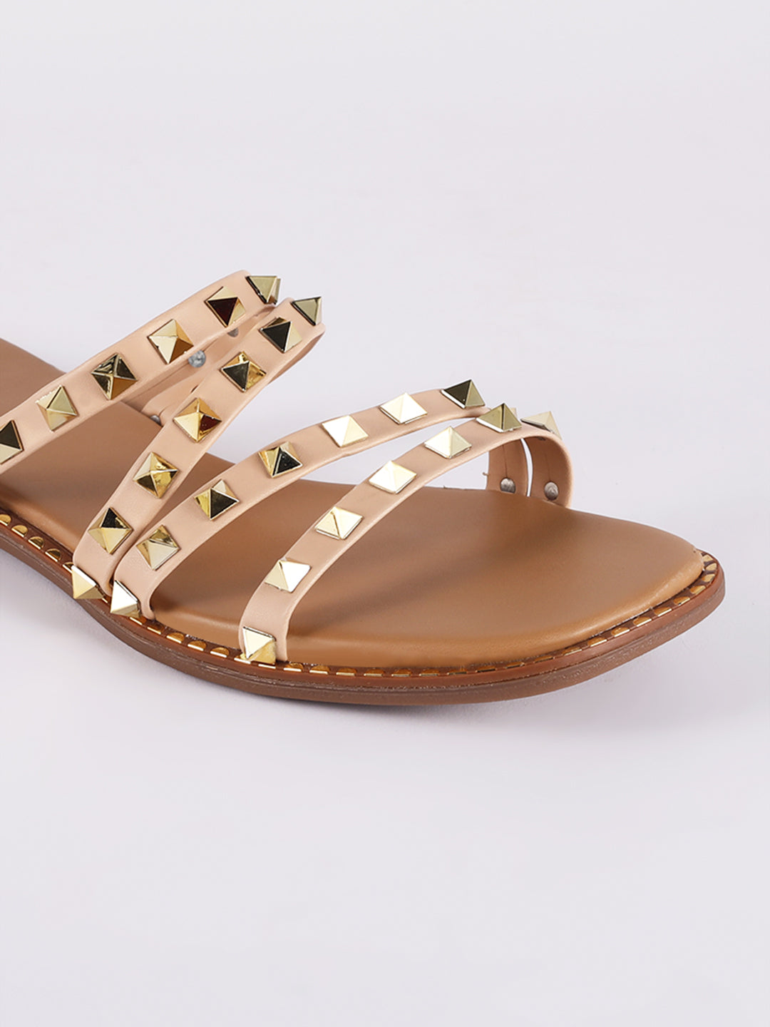 - - - Stylish and versatile flat sandals featuring trendy gold stud embellishments, perfect for a casual day out or a chic evening look.