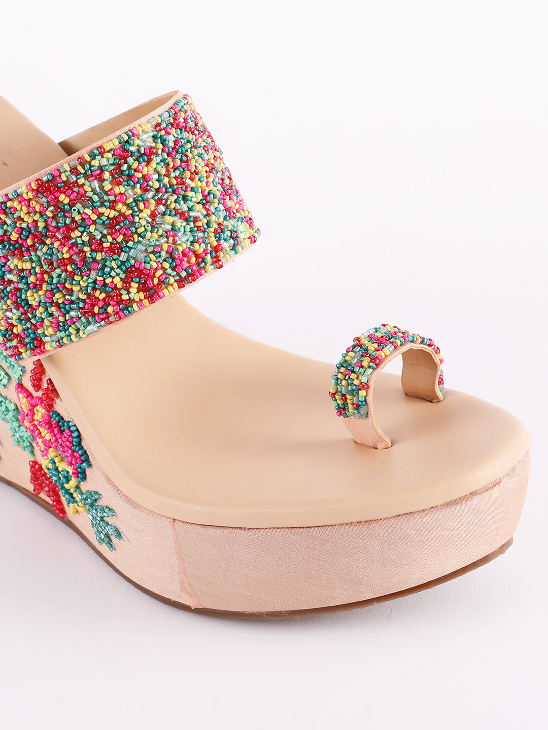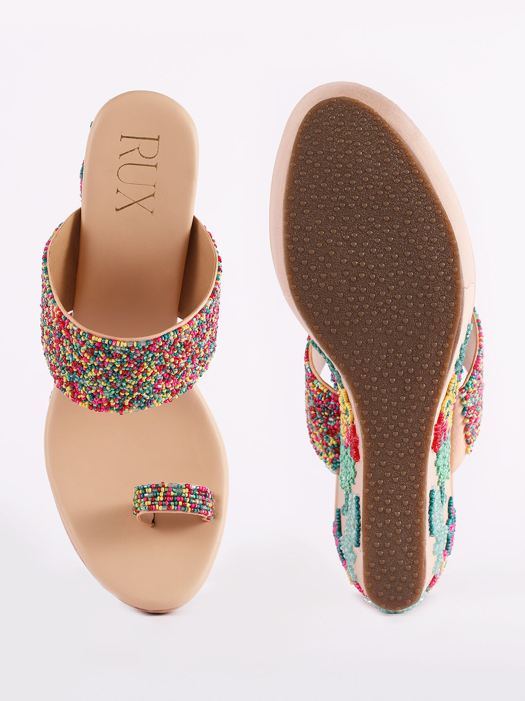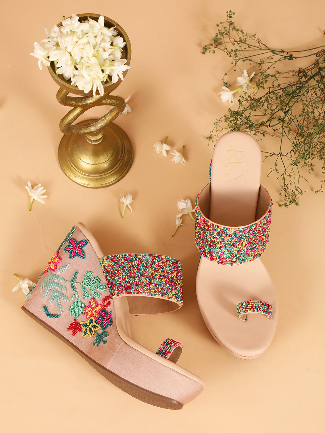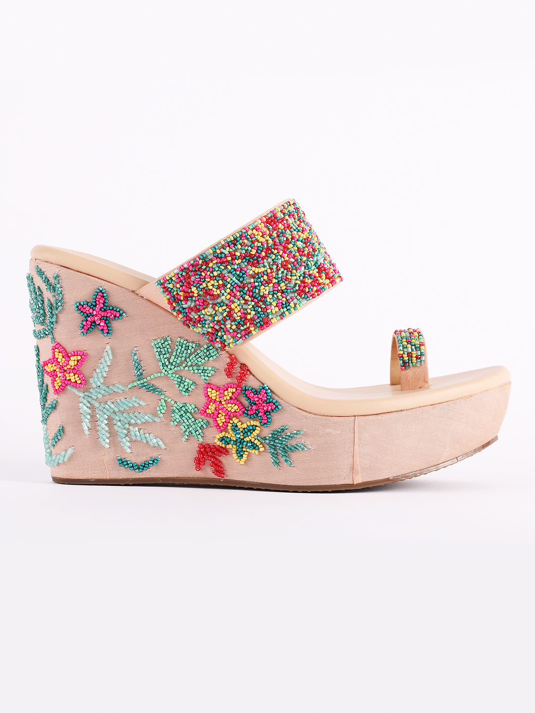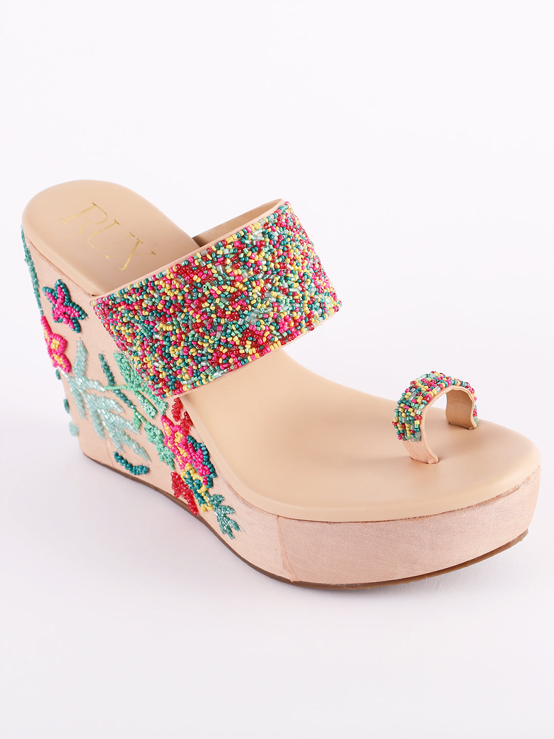 The Rangeel adds height without compromising comfort. It has colorful, hand-embroidered floral beadwork that decorates both the straps and the sides of the wedge.